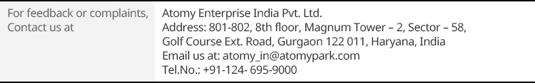 - To know available Pin Code for delivery, Please contact to Customer Care at 0124 695 9000 or write to atomy_in@atomypark.com